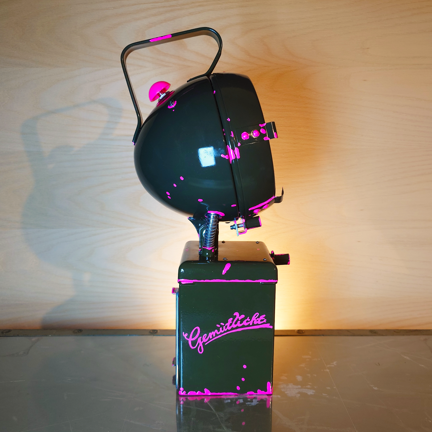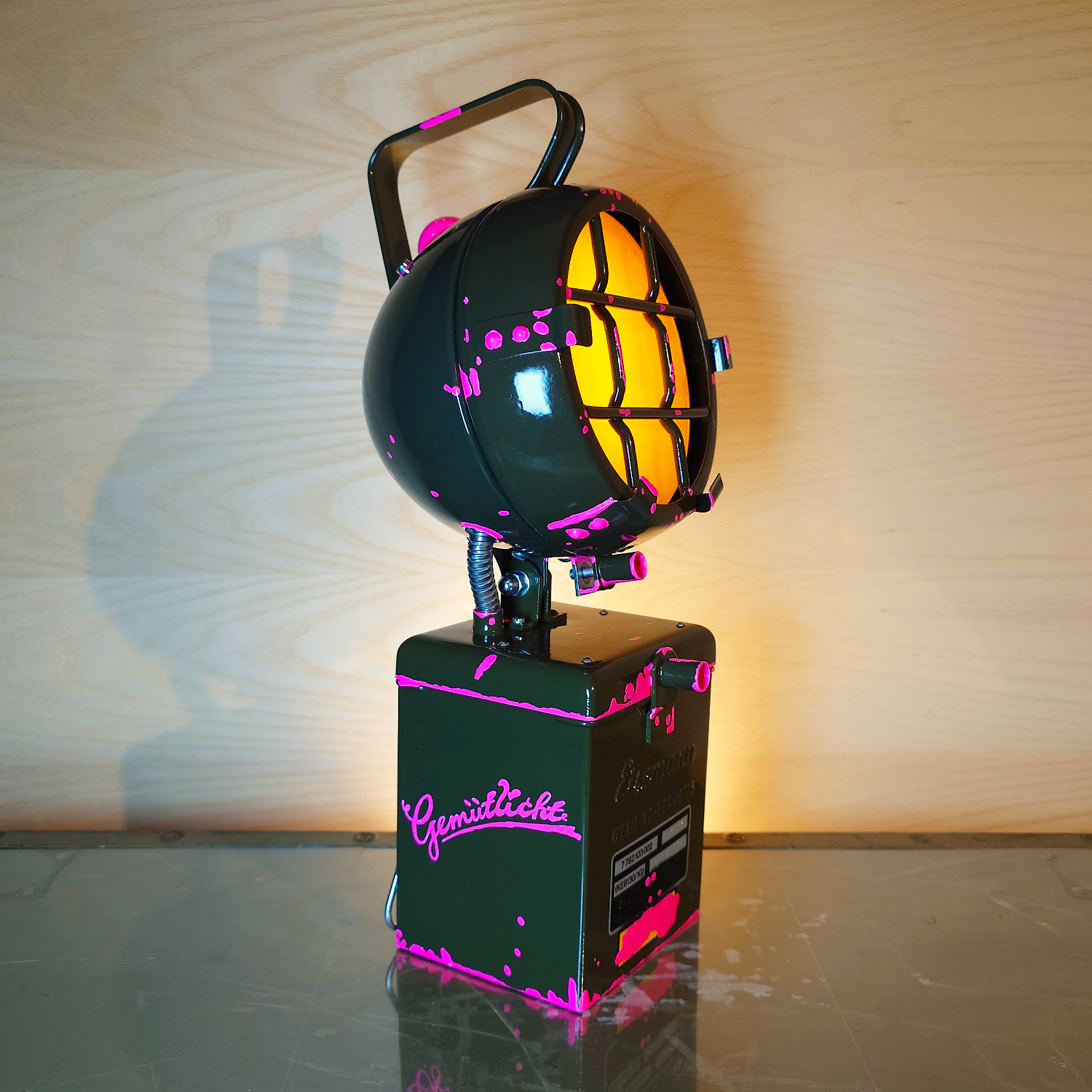 The philosophy behind the lamp on the other hand is much more complex. The Gemutlicht is an upcycling art project. The hand and mine lights from old Bundeswehr stocks are lovingly overhauled in order to return it to the idyll at home: Swords into plowshares.
