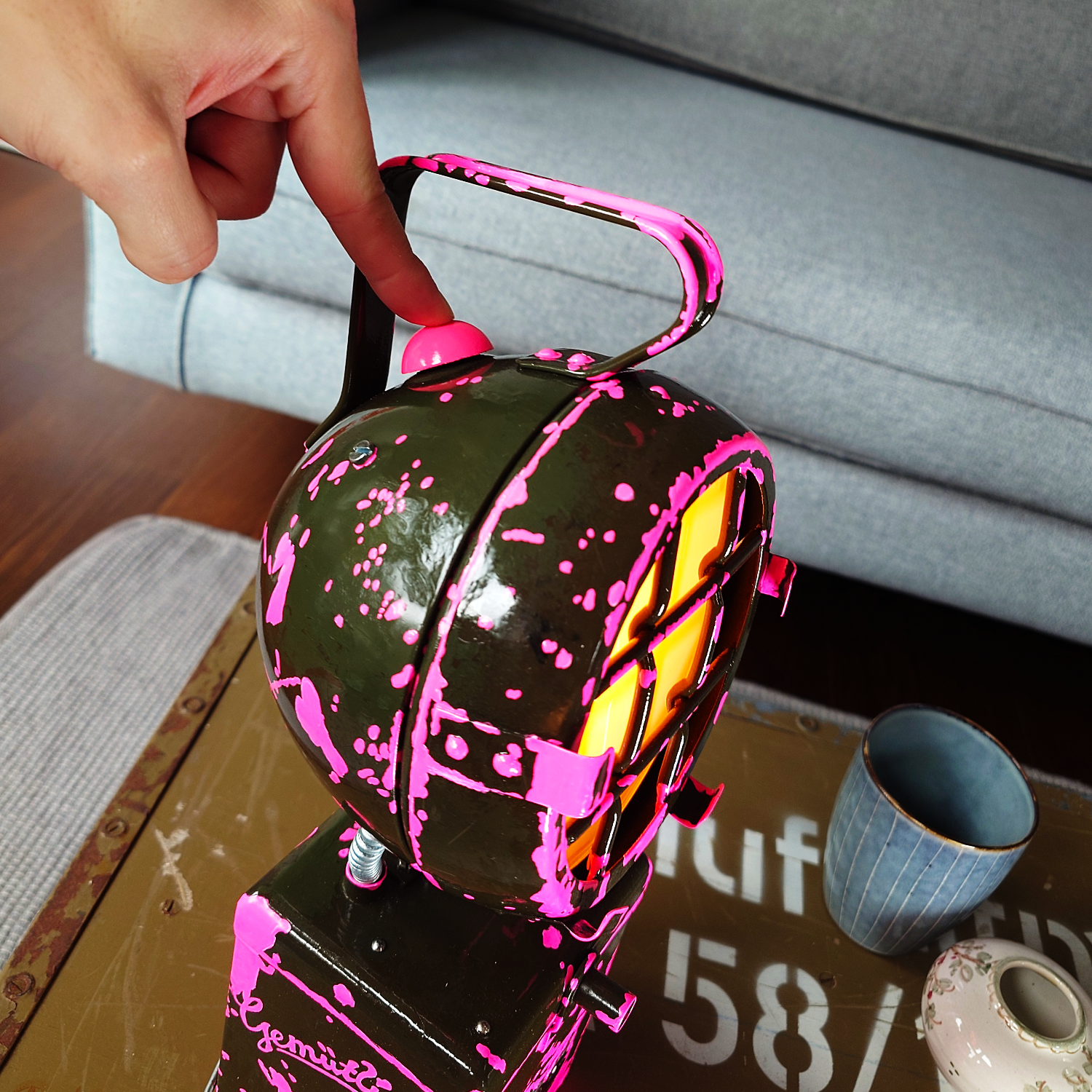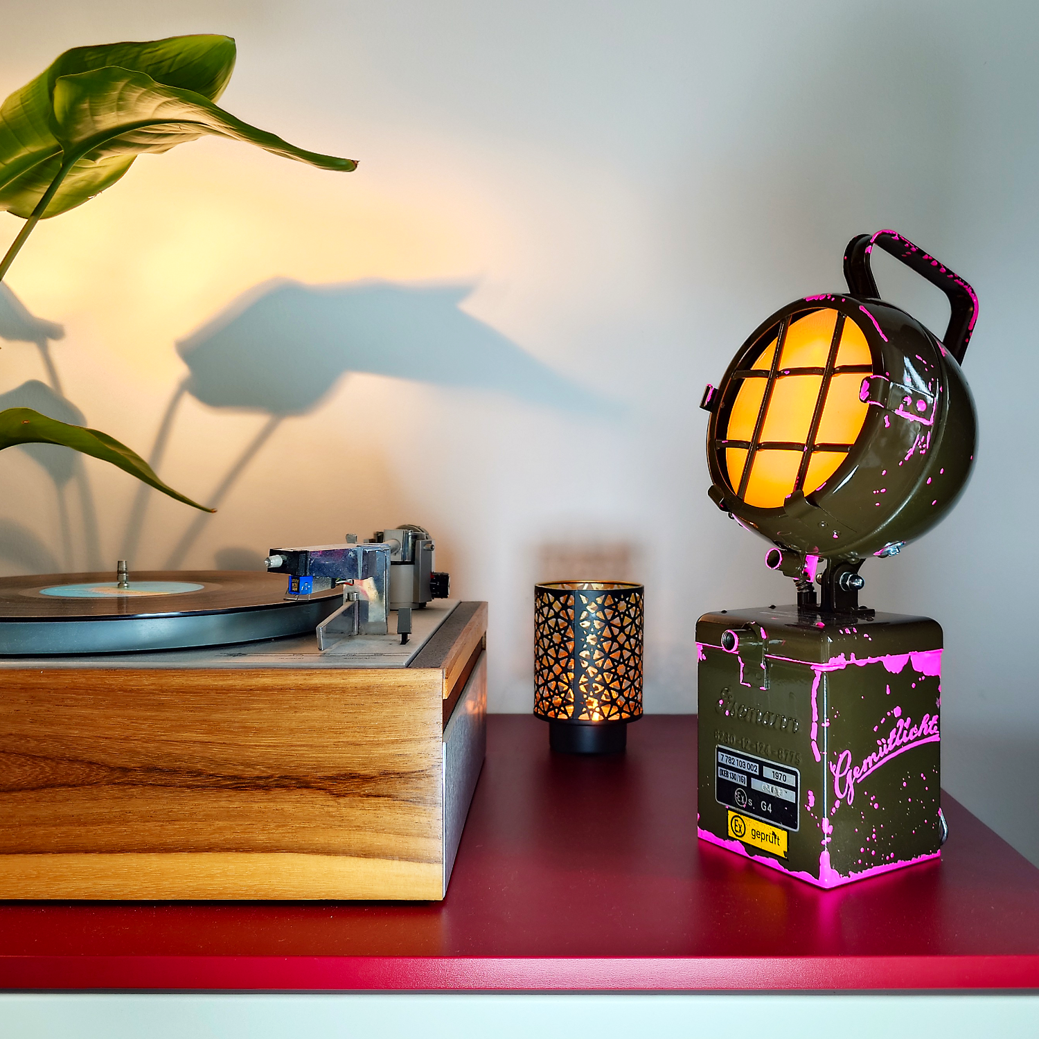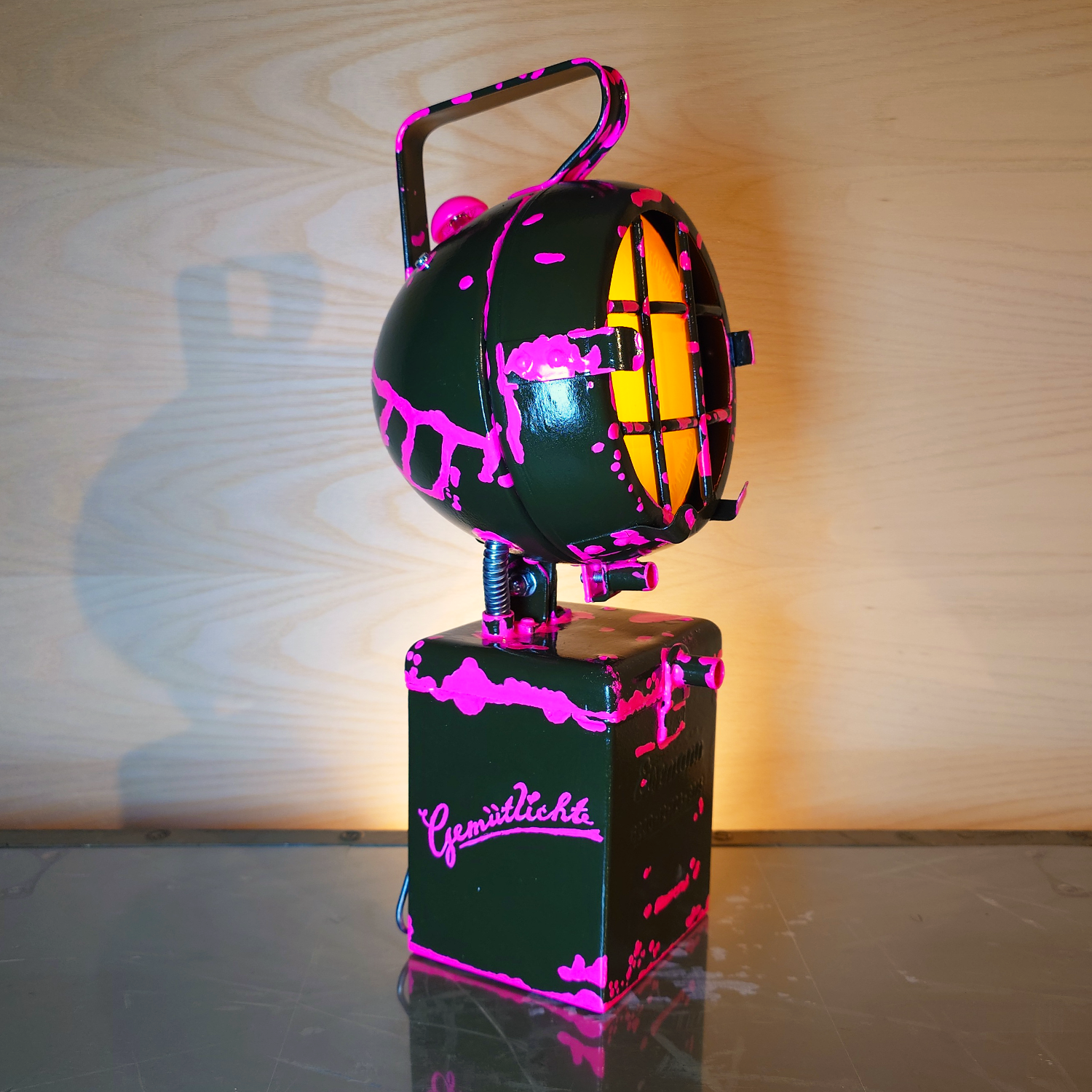 The philosophy behind the lamp on the other hand is much more complex. The Gemutlicht is an upcycling art project. The hand and mine lights from old Bundeswehr stocks are lovingly overhauled in order to return it to the idyll at home: Swords into plowshares.