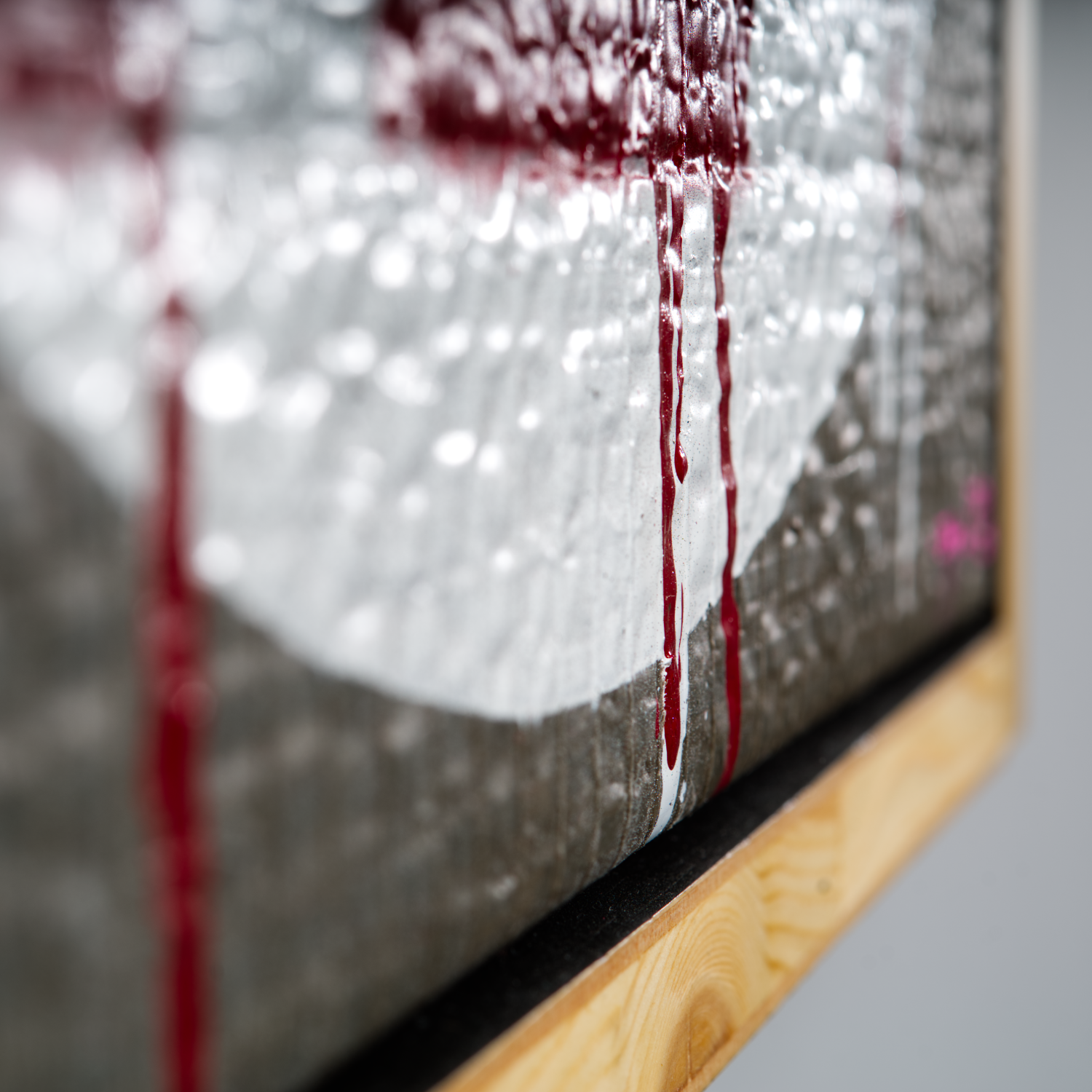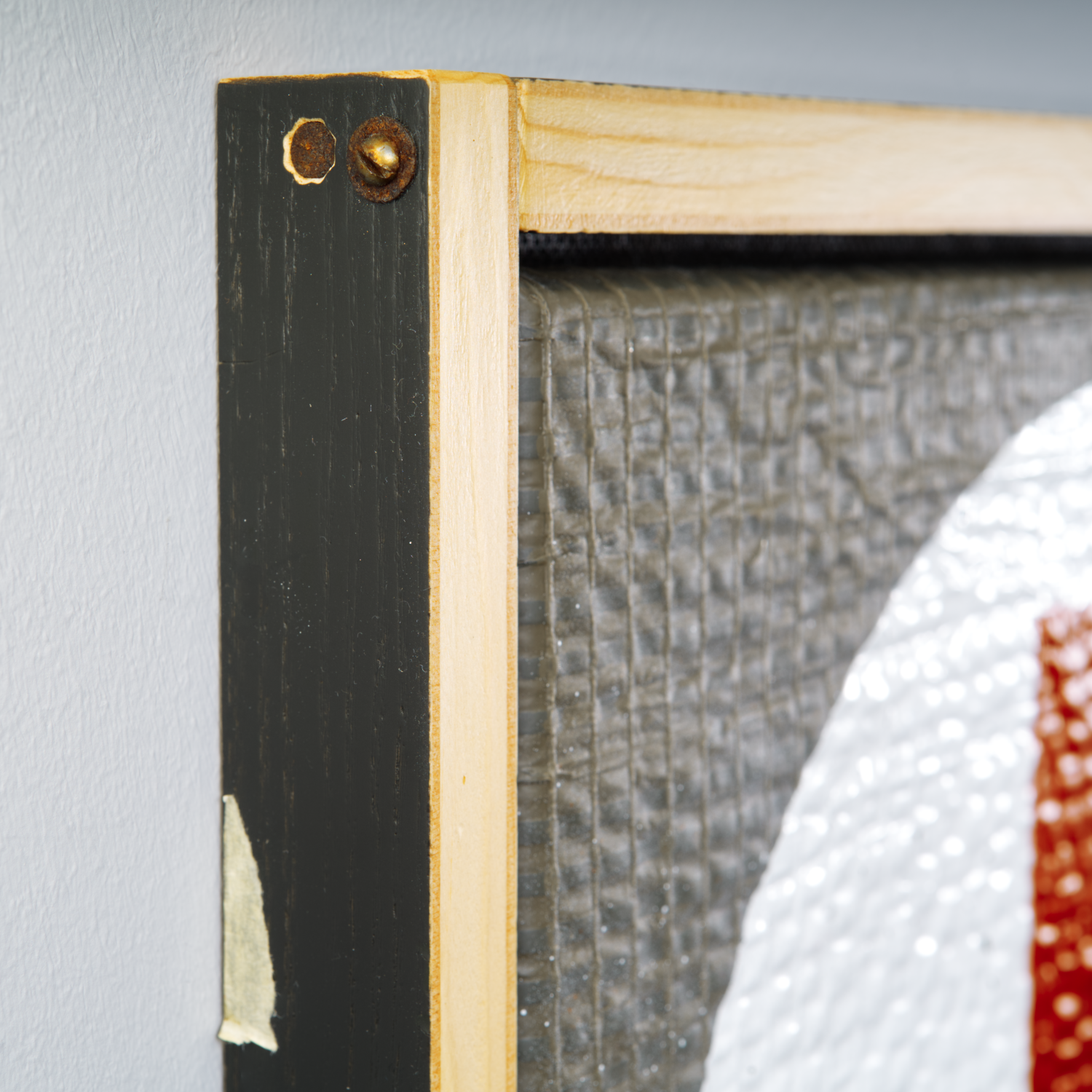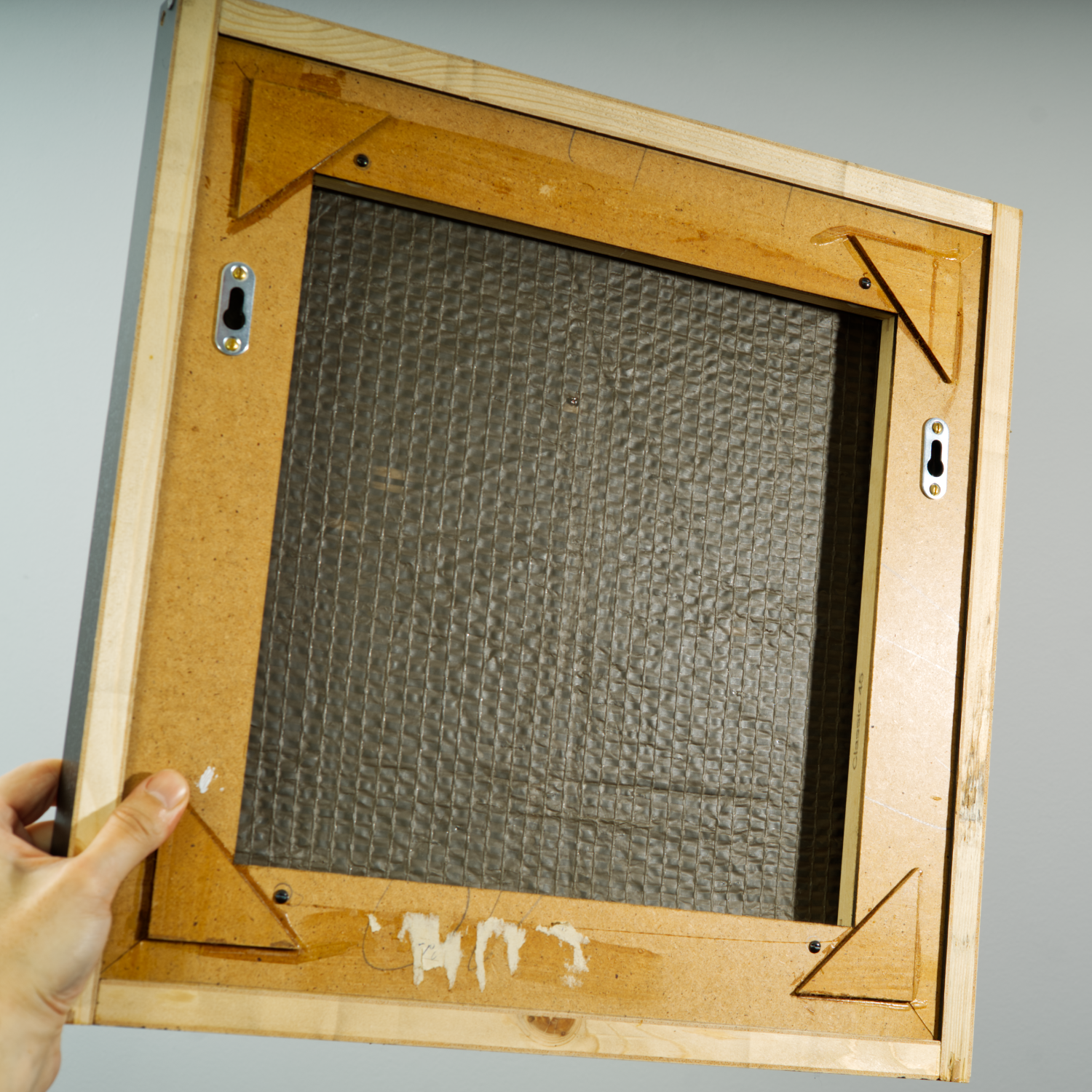 Der Holzrahmen besteht aus Einzelteilen einer von der Bundeswehr eingesetzten Holzkiste.